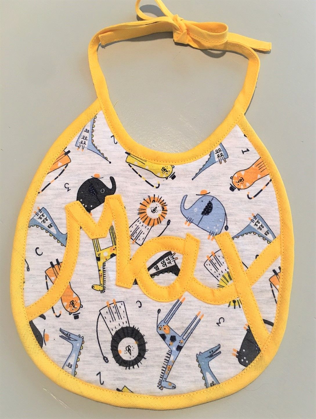 Zoek je een leuk persoonlijk kraamcadeautje? Dan is deze slab precies goed. Snel gemaakt en met de naam van baby (mits niet te lang…) er creatie opgenaaid met biaisband.